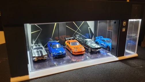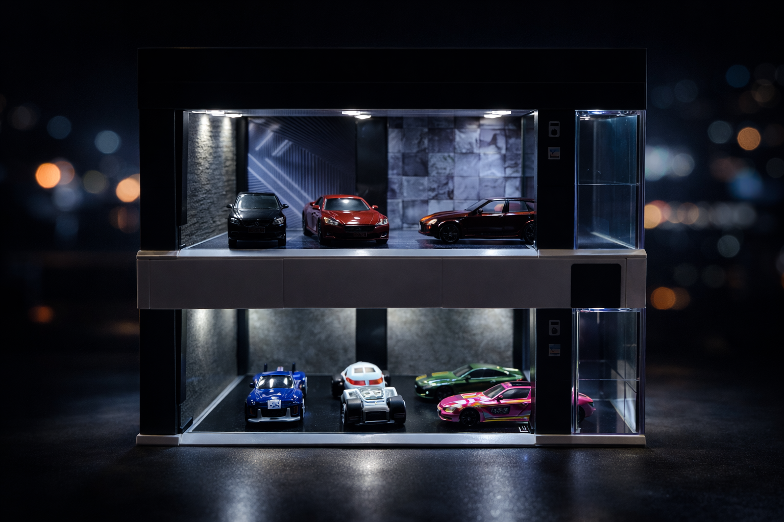 Trwałe tworzywo i przezroczysty akryl chronią modele przed kurzem, a estetyczne wykończenie sprawia, że garaż świetnie prezentuje się w każdej kolekcji.